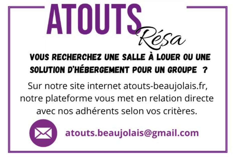Pour faciliter vos recherches d’hébergements ou de location de salles, Atouts Beaujolais met à votre disposition son service Atouts Résa qui vous accompagne pour trouver le prestataire répondant à vos attentes.
