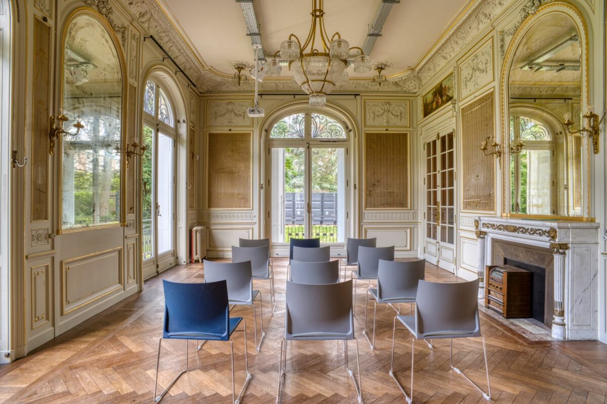Au rez-de-chaussée, quatre salons de charme s’articulent autour d’un hall majestueux surplombé d’une verrière sortie des ateliers Gustave EIFFEL, tandis que le premier étage abrite trois salles de réunion plus intimistes.